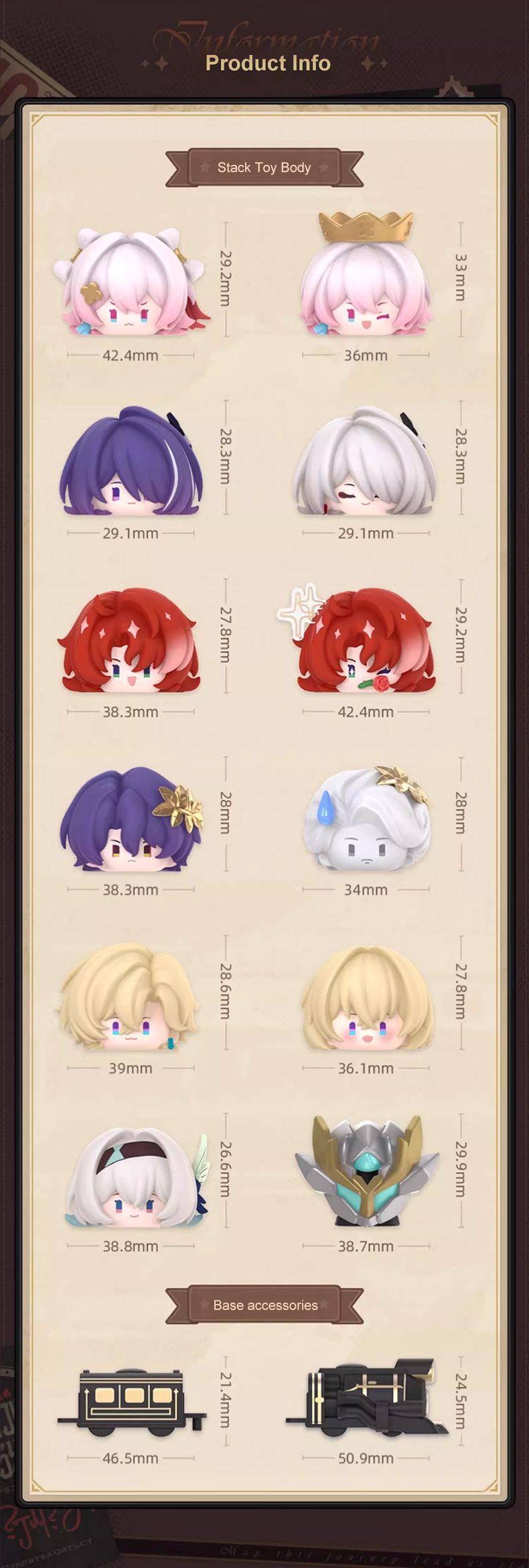 Product Size: Chibi Figure Approximately 26.6-33mm in height, Locomotive Base Approximately 24.5mm in height, Carriage Base Approximately 21.4mm in height
