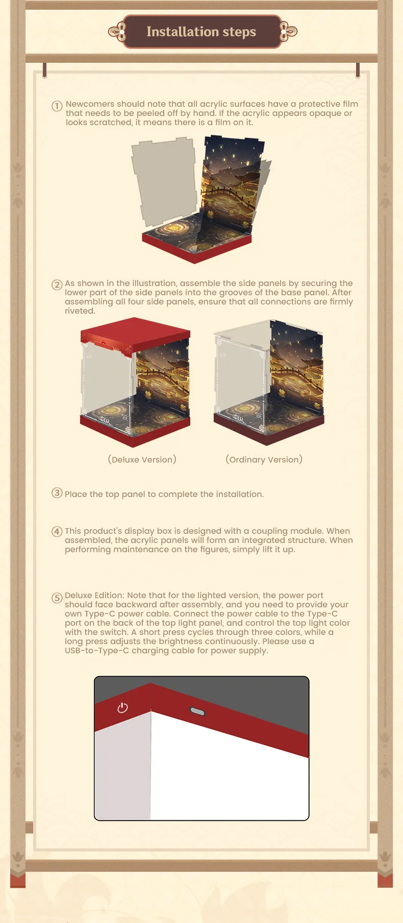 - For the Deluxe Edition, please follow electrical safety regulations when connecting the wiring as instructed. Do not modify or replace the light board or electrical components, and avoid squeezing, pulling, or twisting the wires.